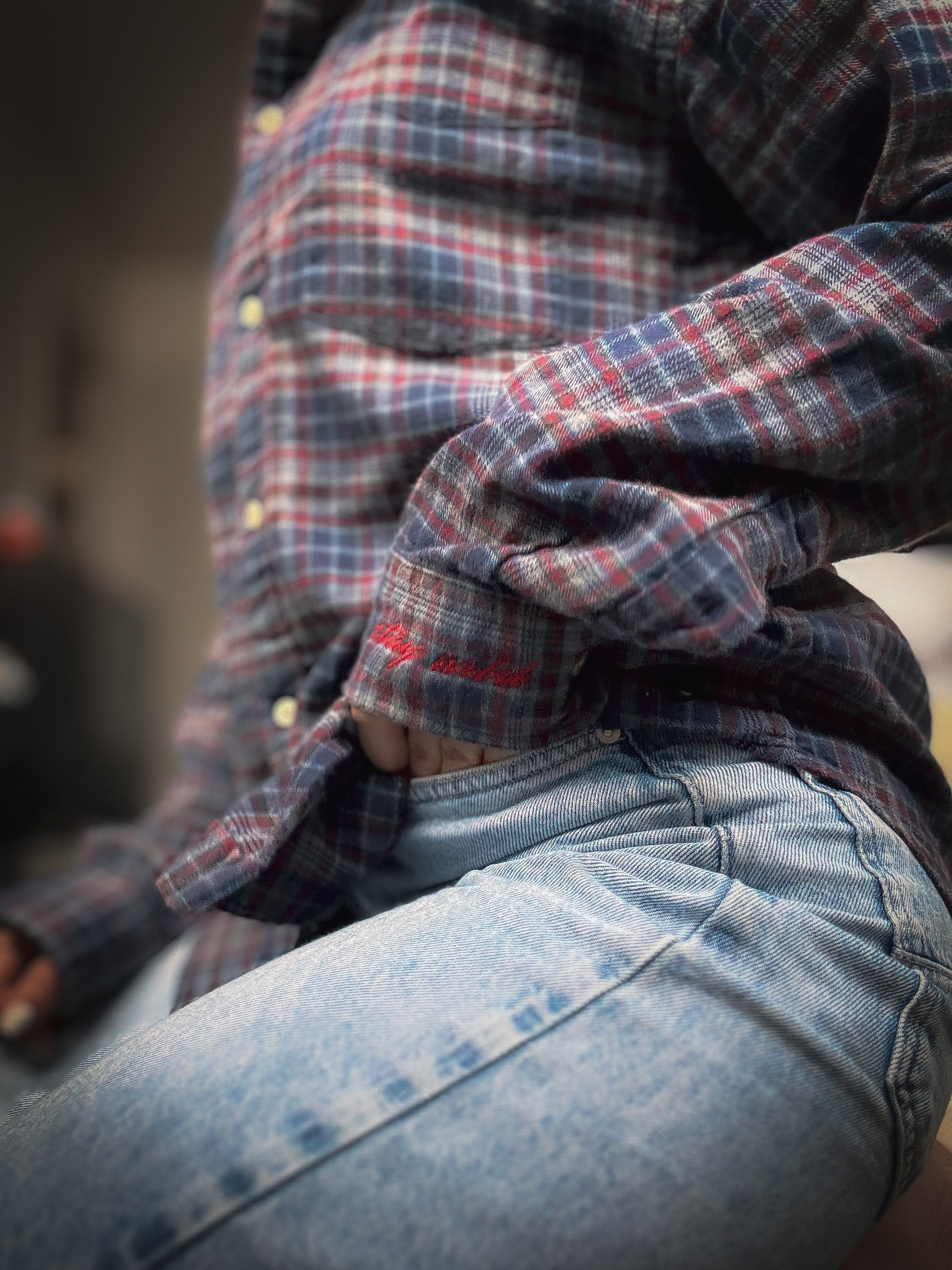A multi checkered preloved shirt upgraded with "Stay Wild" embroidery on the left cuff.
